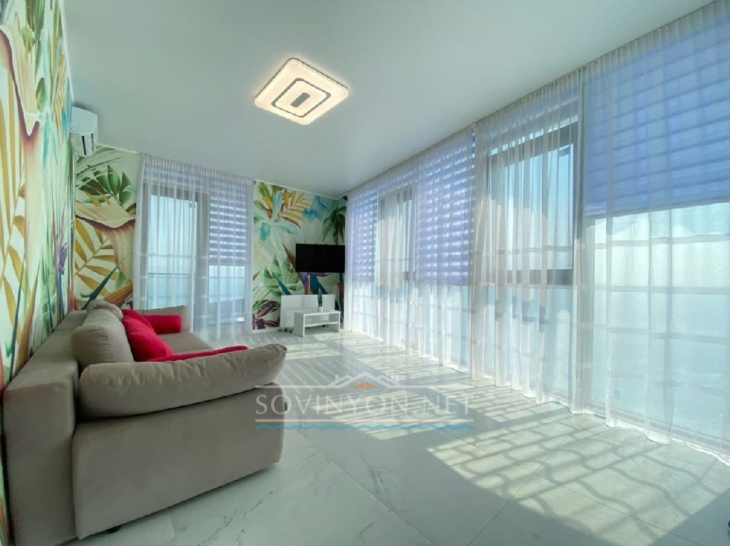 Квартира состоит из двух раздельных спален, кухни, санузла и террасы. Вид на море открывается со всех комнат. На террасе имеется летний столик со стульями для прекрасного времяпровождение с прямым видом на Чёрное море.